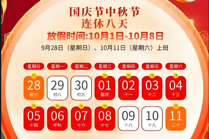 2025年國慶節、中秋節連休。根據《國務院辦公廳關于2025年部分節假日安排的通知》規定,